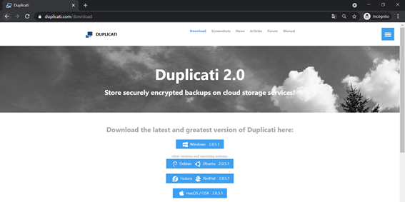 Para llevar a cabo la instalación de Duplicati, hay que descargarlo desde la página oficial de Duplicati en el siguiente enlace, y seleccionaremos el sistema operativo en el que queramos instalarlo.