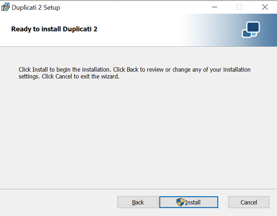 En la siguiente ventana, nos indicará que estamos listos para instalar Duplicati con permisos de administrador. Haremos clic en «Install» y empezará la instalación.
