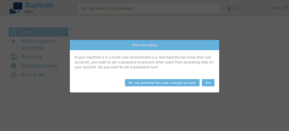 Ya instalado, haremos clic en el icono generado en el escritorio llamado «Duplicati 2», y esto hará que se abra Duplicati a través de nuestro navegador predeterminado. La primera vez que accedamos, nos indicará que si en el ordenador hay varios perfiles de usuario, configuremos una contraseña. Tengamos o no varios perfiles, yo os recomiendo poner la contraseña. Para ello haremos clic en el botón «Yes».