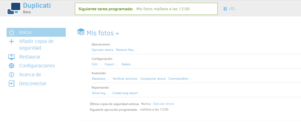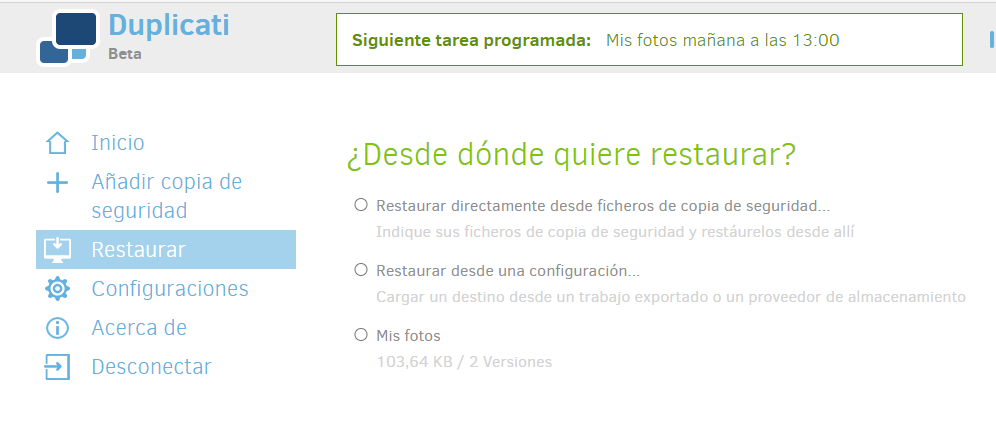 Instalación de Duplicati: Una vez que el sistema operativo esté instalado, debes instalar nuevamente Duplicati en el nuevo sistema.