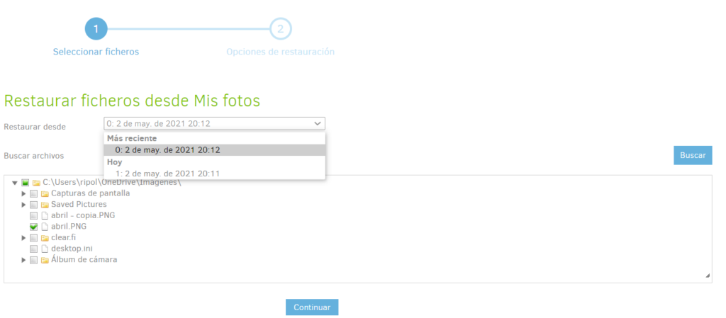 Podremos observar que con el desplegable «Restaurar desde», podemos seleccionar que versión de Backup queremos recuperar, y en la parte inferior, seleccionar el/los archivo/s a restaurar. En este caso he seleccionado el archivo abril.PNG.