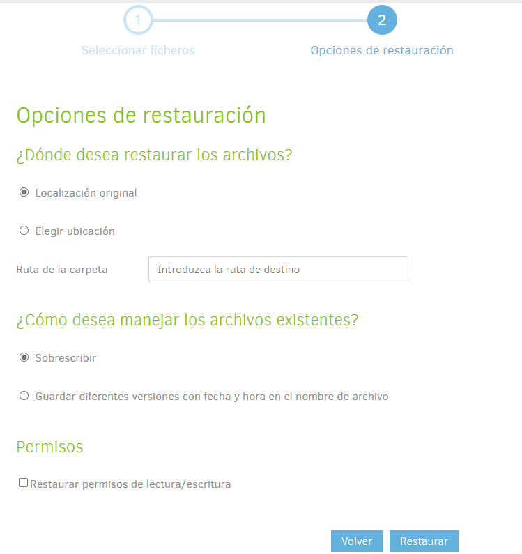 - ¿Dónde desea restaurar los archivos?: Con esta opción, podremos elegir si queremos que se restaure en su localización original o seleccionar una nueva ubicación.