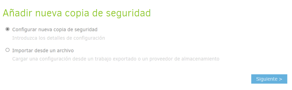 En la siguiente página, podremos seleccionar si configurar una nueva copia o importar alguna configuración existente. En nuestro caso, seleccionaremos la primera opción «Configurar nueva copia de seguridad».