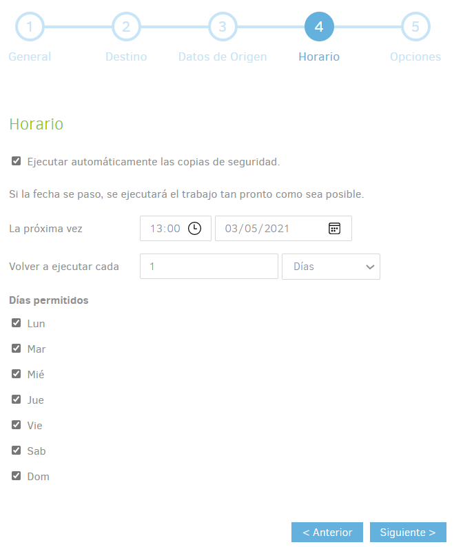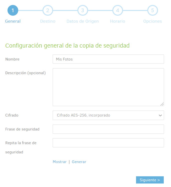 A continuación, tendremos 5 puntos para la configuración de la nueva copia de seguridad: