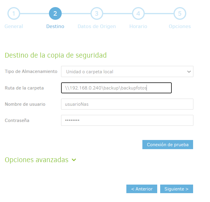 2. Destino: Seleccionaremos el destino de nuestro Backup. En mi caso, dispongo de un disco duro en red (NAS) en la dirección 192.168.0.240 con una carpeta llamada backup/BackupFotos con un usuario de acceso llamado usuarioNAS.