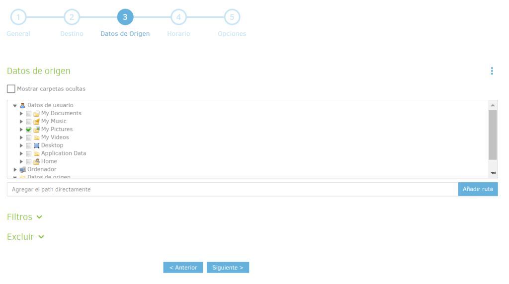 3. Datos de origen: Seleccionaremos las carpetas de las cuales queremos tener un Backup en el disco duro en Red. En este caso, selecciono la carpeta «My Pictures».