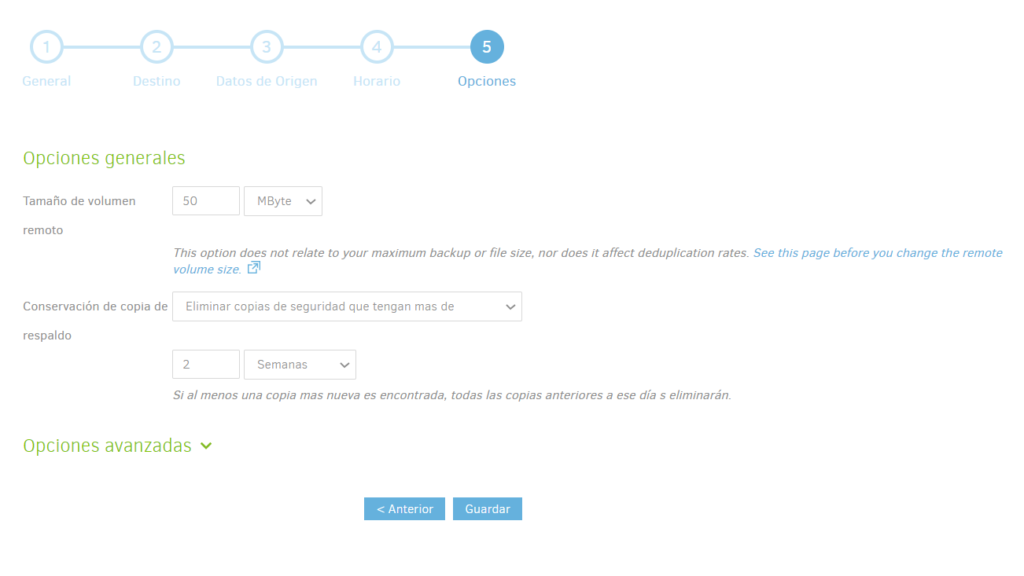 5. Opciones: En este último apartado, configuraremos el tamaño de volumen remoto de los ficheros así como la conservación de las copias. En este ejemplo, pondré que quiero poder recuperar copias de seguridad de las últimas 2 semanas y elimine las copias que tengan más tiempo. De esta manera, nuestro disco duro externo donde almacenaremos la copia de seguridad se irá vaciando para poder continuar almacenando copias de seguridad.
