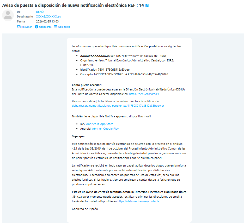 Y el cuerpo era una maravilla del realismo administrativo. Te decía que había una notificación postal disponible, ponía un correo (el mío), un DNI medio tapado, un organismo emisor con nombre largo (Tribunal Económico Administrativo Central), un “DIR3”, un identificador con letras y números, el concepto de la notificación (“reclamación” con numeritos)… y luego, lo que siempre ponen: que la puedes descargar en la Dirección Electrónica Habilitada Única (DEHÚ) y que para tu comodidad te dan un enlace directo.